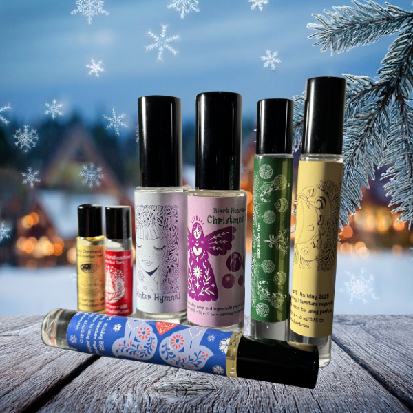 Holiday themed scents all dressed up in colorful seasonal collection labels, perfect for gift giving!