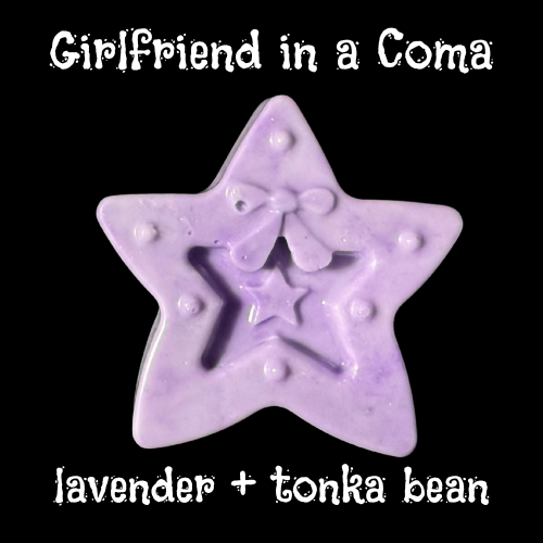 Girlfriend in a Coma (Star/Lavender) -Designed to give one a sense of calm to relieve stress and help guide sleep. Not wanting a mainstream “baby blend” of lavender and vanilla, we made our fragrance with more depth and warmth. We used a lavender blend that is more herbaceous than floral. We then added tonka bean and sandalwood to a not-too-sweet vanilla musk base. We call it a liquid lullaby! (Star Shape May Vary)