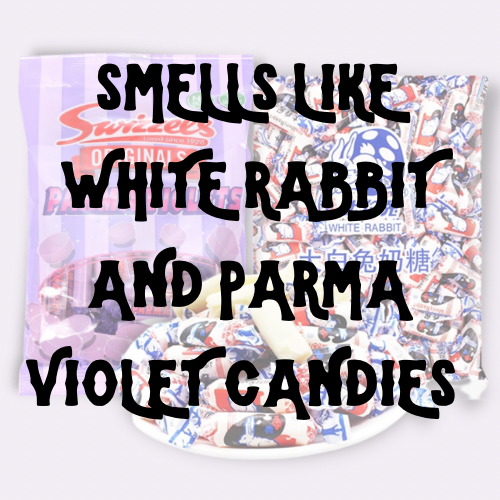 Violet leaf absolute, along with subtle notes of clove and white musk create a Parma Violet candy accord. Lactonic notes of sweetened condensed milk and whole milk powder are blended with vanilla bean and rice paper to create a White Rabbit candy accord. Light touches of ylang ylang and cedar tamp down the sweetness. These two candy inspired scents combine to create a demure fragrance that evokes nostalgia and comfort.